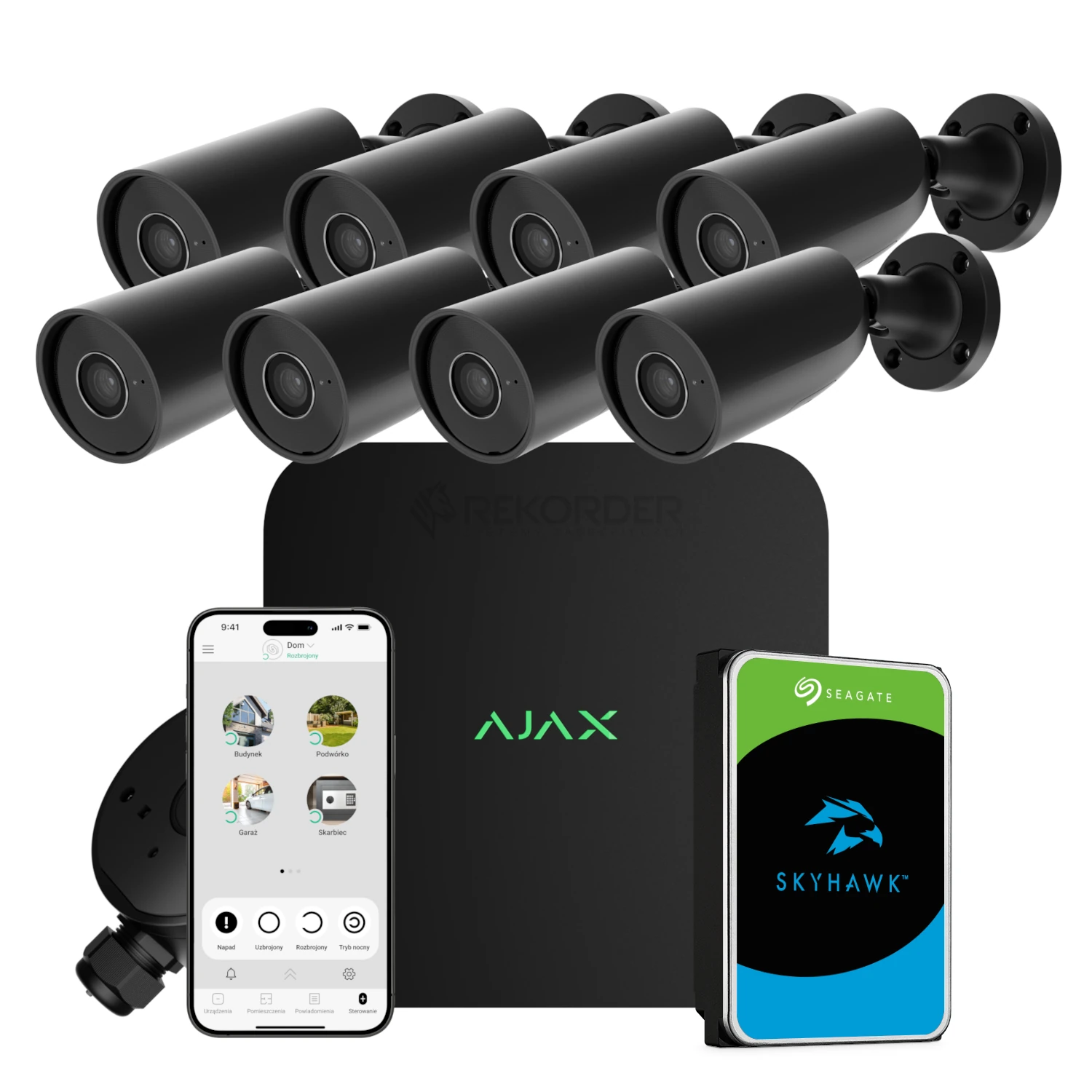• 8 × kamera IP AJAX BulletCam Black 5MP / 2.8 mm – rozdzielczość 2880 × 1620, szeroki kąt widzenia ok. 100–110°, IR do ok. 35–50 m, obudowa IP65, zasilanie PoE